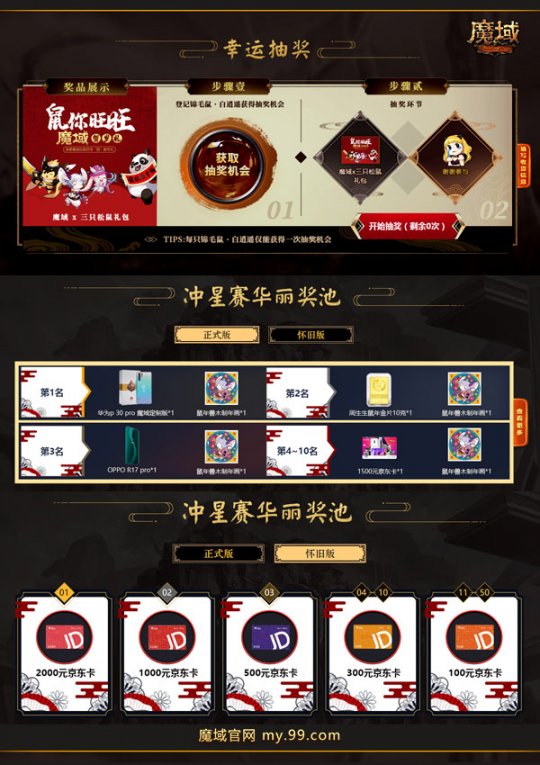 此外在1月8日至2月9日间,《魔域》还将根据各大服务器玩家鼠年兽星级养成数据,设置鼠年兽冲星正式版榜单、鼠年兽冲星怀旧版榜单。在正式版鼠年兽培育星级分数的前200名,可按照服务器对应的名次瓜分华为P30 pro 512G 魔域定制版、荣耀10青春版、OPPO R17 pro 8G、鼠年兽木质年画等海量实物奖励;怀旧版的前50名玩家则有机会获得千元京东卡福利!另外,所有拥有鼠年兽的玩家,还可在游戏内置界面进行登记参与幸运抽奖,共享300个三只松鼠礼包,心动不如赶快行动!