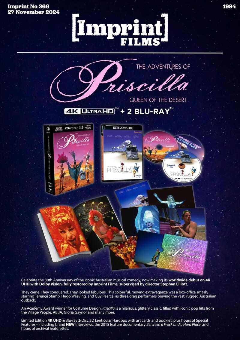 接下来,Imprint授权到了斯蒂芬·埃利奥特导演的1994年作品《沙漠妖姬》,这部同性题材的经典喜剧音乐片源自于米高梅片库,Imprint出资进行了全新的4K修复,且得到了导演的监督。此次UHD套装以兼容HDR10的杜比视界规格呈现全新修复,配以DTS-HD MA 5.1音轨,除去两张正片叠外,还有单独一张花絮与纪录片盘,主要收录了2015年制作的一小时幕后回顾纪录片《连衣裙与坚硬之地间》以及导演埃利奥特与演员马克·霍姆斯的全新采访。其余内容为旧花絮打包携带,包括五段幕后特辑、删减片段以及NG段落。