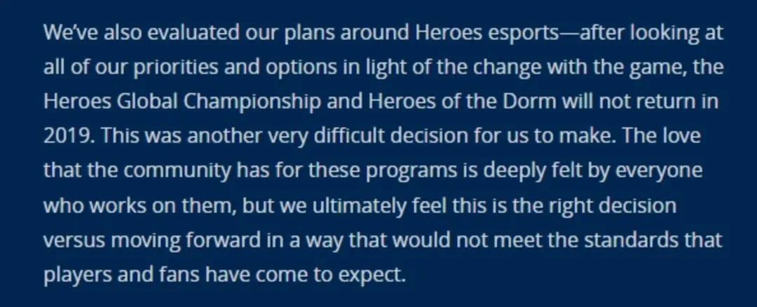 2018年12月,动视暴雪宣布,将《风暴英雄》的部分开发成员转移到其他项目,并停办风暴英雄全球冠军赛。