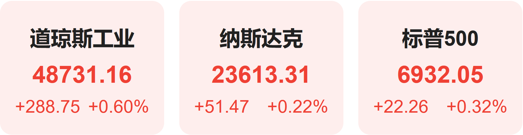 截至收盘,标普500指数涨0.32%,报6932.05点,创收盘新高,另还创下了6937.32点的盘中纪录;道琼斯指数涨0.60%,报48731.16点,刷新了12月11日录得的收盘纪录;纳斯达克指数涨0.22%,报23613.31点。