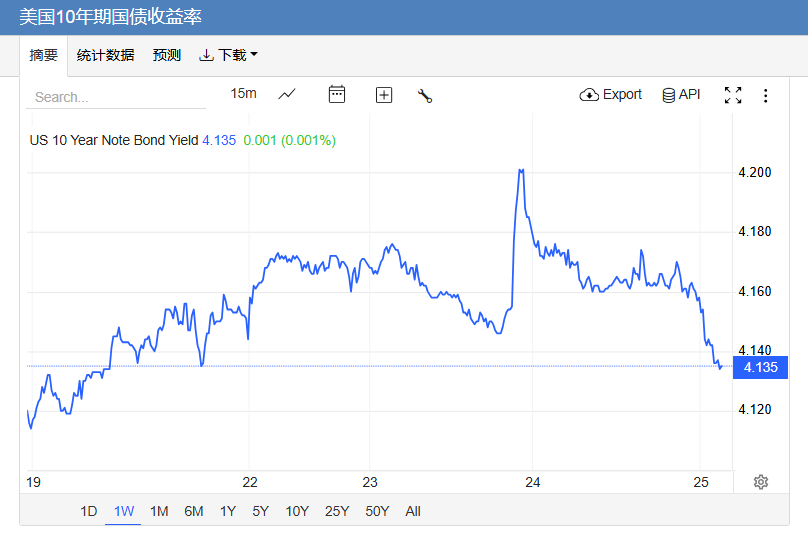 美债收益率走低,基准的10年期美债收益率最终收报4.135%,对美联储政策利率敏感的2年期美债收益率收报3.514%。