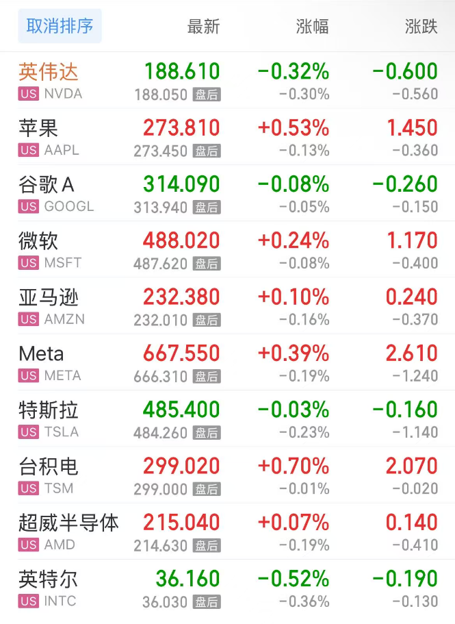 热门美股中,英伟达跌0.32%,苹果涨0.53%,谷歌C跌0.00%,谷歌A跌0.08%,微软涨0.24%,亚马逊涨0.10%,Meta涨0.39%,特斯拉跌0.03%,台积电涨0.70%,超威半导体涨0.07%,英特尔跌0.52%。