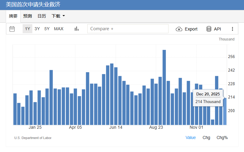 重要经济数据方面,美国劳工部周三公布的数据显示,截至12月20日当周,首次申请失业救济人数减少1万人,至21.4万人,低于预估的22.35万人,而这导致外界下调了美联储明年初降息的预期。机构对经济学家调查得出的预期中值为22.4万人。持续申领失业救济人数在此前一周升至192万人。近期新申请人数波动较大,这在节假日前后实属常态。
