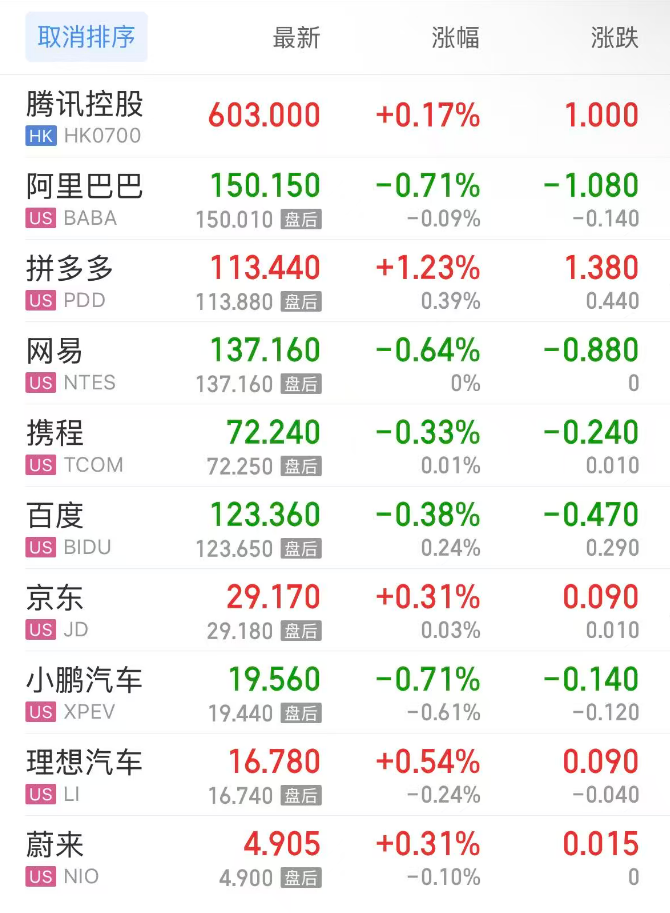 热门中概股方面,腾讯控股(港股)涨0.17%,阿里巴巴跌0.71%,拼多多涨1.23%,网易跌0.64%,携程跌0.33%,百度跌0.38%,小鹏汽车跌0.71%,理想汽车涨0.54%,蔚来涨0.31%。