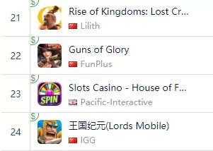 除了这两款游戏之外,我们栏目经常见到的“美国出海SLG三驾马车”在本期的排名也分别在21,22和24位,距离上榜也仅有一步之遥。从数量上来看,能够在美国市场取得出色表现的出海游戏还是以SLG为主。