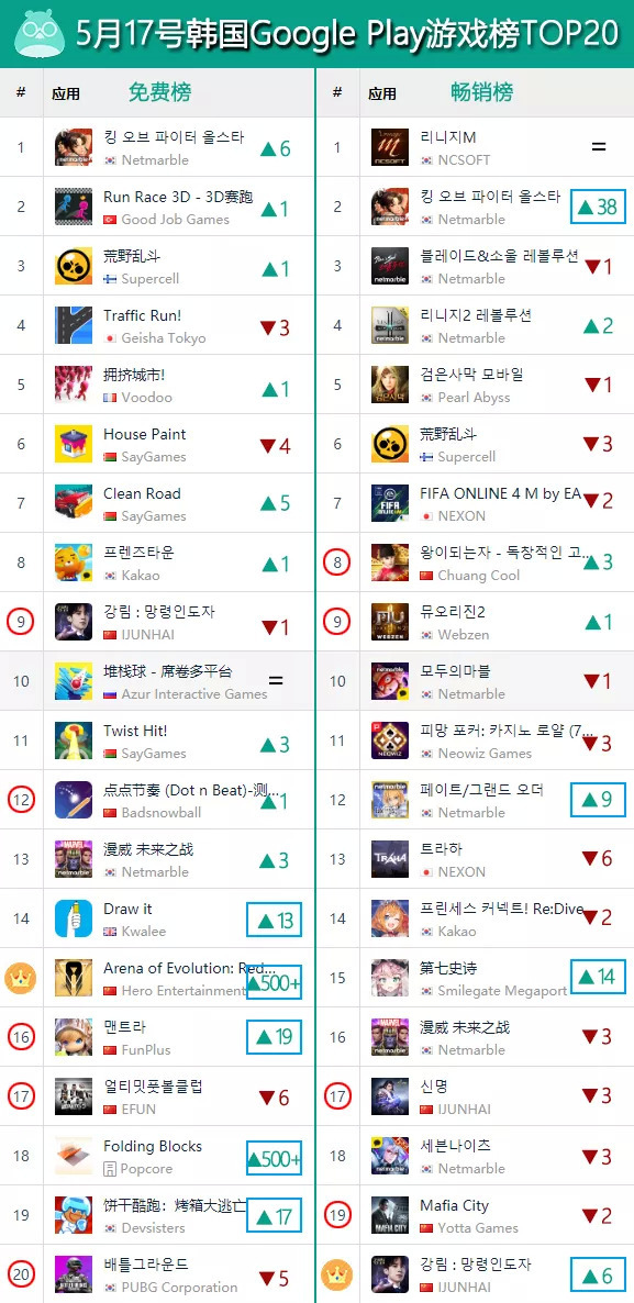 注:下列图表中红圈标示均为中国出海游戏,篮框标示均为本期新上榜游戏。