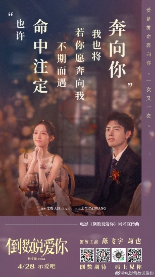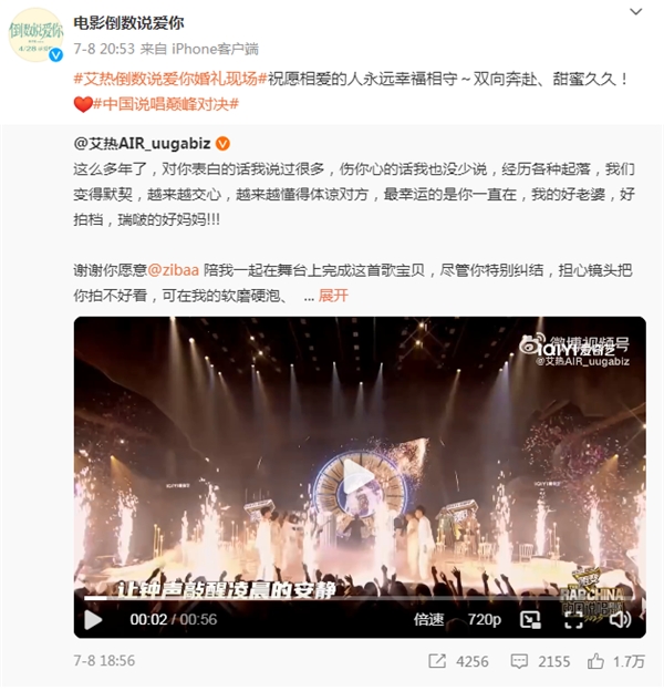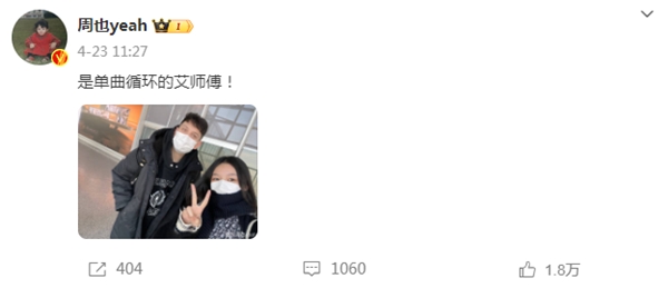 曾演绎“婚礼三部曲”的艾热、王以太还为陈飞宇、周也主演爱情电影《倒数说爱你》创作演唱同名宣传曲MV,周也与艾热合影并发布微博“是单曲循环的艾师傅”。