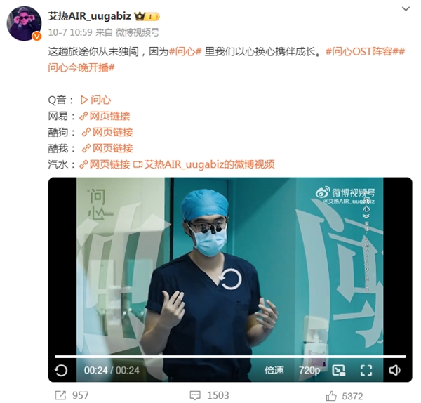 作为影视剧OST,说唱音乐在叙事和抒情上更有优势,不仅具有充沛的情感情绪表达,在传递影片核心主题上也显现出极强的精准度和力量感。近期由赵又廷、毛晓彤主演的都市医疗情感剧《问心》,也由艾热演绎同名主题曲,“让我的初心延续希望,再深的黑夜也要去前往”“让我的初心守住光亮,记得这趟旅途你从未独闯,我会陪在你身旁,穿过人间的跌宕”,艾热有穿透力的声音唱出了内心的温度与力量,高燃治愈。