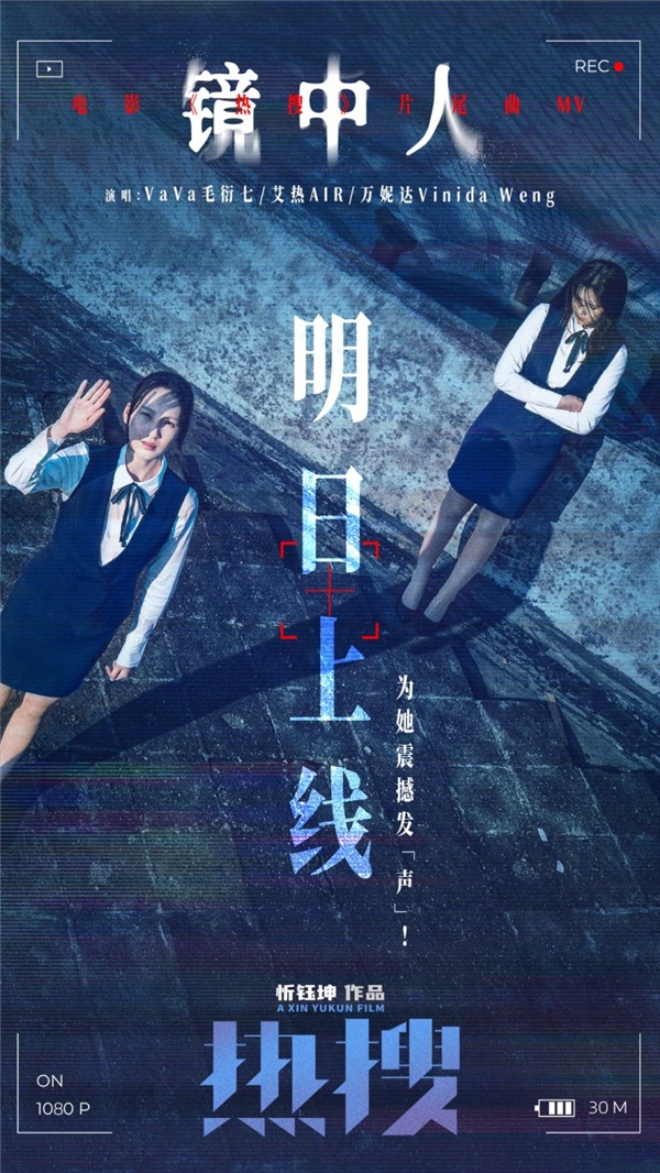 12月3日,热映电影《热搜》发布片尾曲《镜中人》MV。歌曲由歌手艾热AIR、VaVa毛衍七、万妮达Vinida Weng作词作曲并演唱。现实又犀利的歌词,是为影片中受到伤害的张小穗发声,更是为无数的她发声。该片由忻钰坤执导,周冬雨、宋洋、袁弘领衔主演。